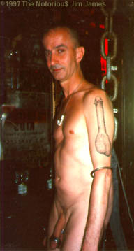 Photo at left was taken in the Hole in the Wall Bar, mid 1997, in the Back, near the DJ Booth. Photos are difficult here, because of the lighting conditions, and the objections of most Patrons. We took care not to include others. Yeah, I'm almost always naked at the Hole. |