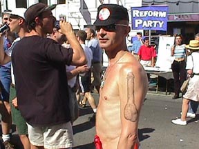 I sensed a touch of disorganization in the crowd. More straight couples, and tourist types than I remember in previous years. There were clogs of very slow moving people. Not the fullest variety of Leather and Fetish that I've seen in previous years. But to say the crowd was different was not a bad thing or a disappointment. There were all the standard features: A goodly variety of men. Some magnificent tat work. Lots of music, food, cameras. I saw lots of lens ends. A full 1/3 of the cameras I saw were digital. Many Sonys. Very few Kodaks.