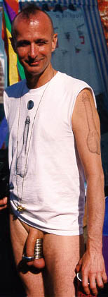 I wore my chainmail harness, 13 sanded rings on my balls, heavy chrome ring and circ barbell behind my dickhead, a black cap and Paratrooper zip boots. That was it. So I was quite naked. My intention. Pix are in the pipeline, but I have none yet. I'll post as soon as I get.
