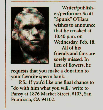 In his passing, I feel I own part of him now more than was possible before. The part we had in common. The desire to show it. The desire to publish and be heard: our sexuality, and sense of what is individually right for each of us. That which makes us hard and gets us off. Yay Scott. You did good.