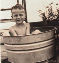 9R @ 4, State College, PA, c. 1951, hot days. I discovered red dirt. I liked looking at the cold forests, the farmers' plowing, and the wild hills. I had an imaginary friend, neighbor boys, 2 younger sisters, and a baby brother. My parents rented the Quonset Hut we lived in while my dad went to college and worked in a gas station, and my mother took in laundry: the Tub source. |