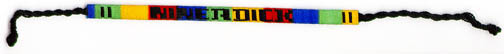 There were lots of people. The crowd was well accommodated by the layout, the baracades, the plan. The planners got it right. None of the unmoving clogs that were present at the Folsom St. Fair. Police coverage was heavyish. They served well. There were no incidents that needed intervention that I saw in the 5.5 hours that I walked around in the warm sun. I didn't pay much attention to the vendors, except for Two: One was the mask stand from New Orleans. Some wonderful masks. And high prices. Beyond my budget, but not overpriced. The other was a very modest stand run by a guy from Peru. He made string bracelets right there, from scratch, with custom lettering. Above is the one he made for me. Some spanish speaking guys were hanging out there, joking about sex, and cock sizes. One asked the others: "Am I fat?" Another guy answered: "You are fat in your cock."