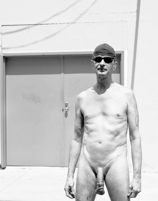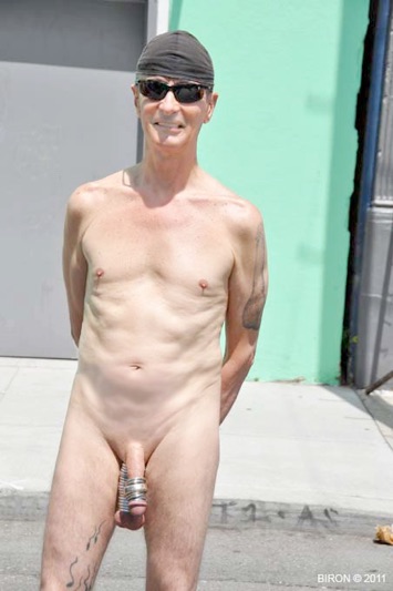 July 31, 2011: Up Your Alley Fair 2011 was pretty good. I arrived just before 1 PM. Weather was about 66 degrees, mostly overcast, but the cloud cover was not heavy, and the sun did peak through for some minutes repeatedly until about 5 PM. So I could warm up in the sun. I walked through the fair to a spot I like near the Planet Saab Garage on Dore Alley. This spot is left empty each year, for unadvertised reasons. It is flat, in the sun, and right next to the passing crowd. So there are good sight lines for people to see me, and take pictures. I decided this year to not pass out cards, asking those who take pix of me to send ‘em, because this doesn’t work very well. I’ll get one, maybe two responses from 30-50 cards passed out. It wears me down to do the asking. So I decided to relax, just enjoy being a dick standing there.