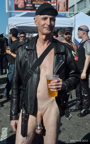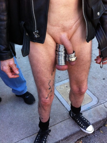 Up Your Alley – Dore Alley, was just about perfect for weather (high 60s, pushing 70 and calm, bright sunny, no clouds, with a good nearly all male (assume Gay and Gay Intent) crowd. Maybe not quite as many cameras as in years past. I spent most of my time in the alley, but did walk the whole fair, following the sunshine. Saw some friends, but less than expected. I wore my rings, Chuck Taylors, black socks, black leather MC jacket, and my black welder’s cap. Pulled my white cotton tights off as soon as I got on the alley. I stood in the shade part of the time to allow for better photos, with no hard cast shadows. So far, I’ve rec’d three photos by email, with very friendly notes, and found one other posted on the net. All four posted above. Hoping for more. There were a few blow jobs here & there; tasting sessions, I suppose: I saw no climaxes, and no fucking. I did see one public piss scene. 3 guys traveling together, pissed on each other, entirely clothed in policesque uniforms & leather. Expensive use of uniforms & leather. Some very pretty young men, and handsome older men. A fair amt. of nudity, but probably not more than 5%; lower, I observe, than some years past. People were friendly, cordial, chatty. Saw a few people who I only see at these events. As the fair ended at 6 PM, I watched the street traffic from outside the Powerhouse. About 6:30, when the line was reduced, I went inside. I eventually found a high bench to sit on. A guy I casually know came over, played with my dick for what seemed like forever before I shot a huge spurting load into the crowd. He was playing very lightly with my frenulum and dickhead. Edging, light touch tease is a Niner fave fetish. I left at about 11:30, caught a cab home. Had an extended hot shower, and was in bed by 12:30. Slept, but woke a few times through the night with sore feet. All Stars do not provide much support. Maybe should have worn my boots.
